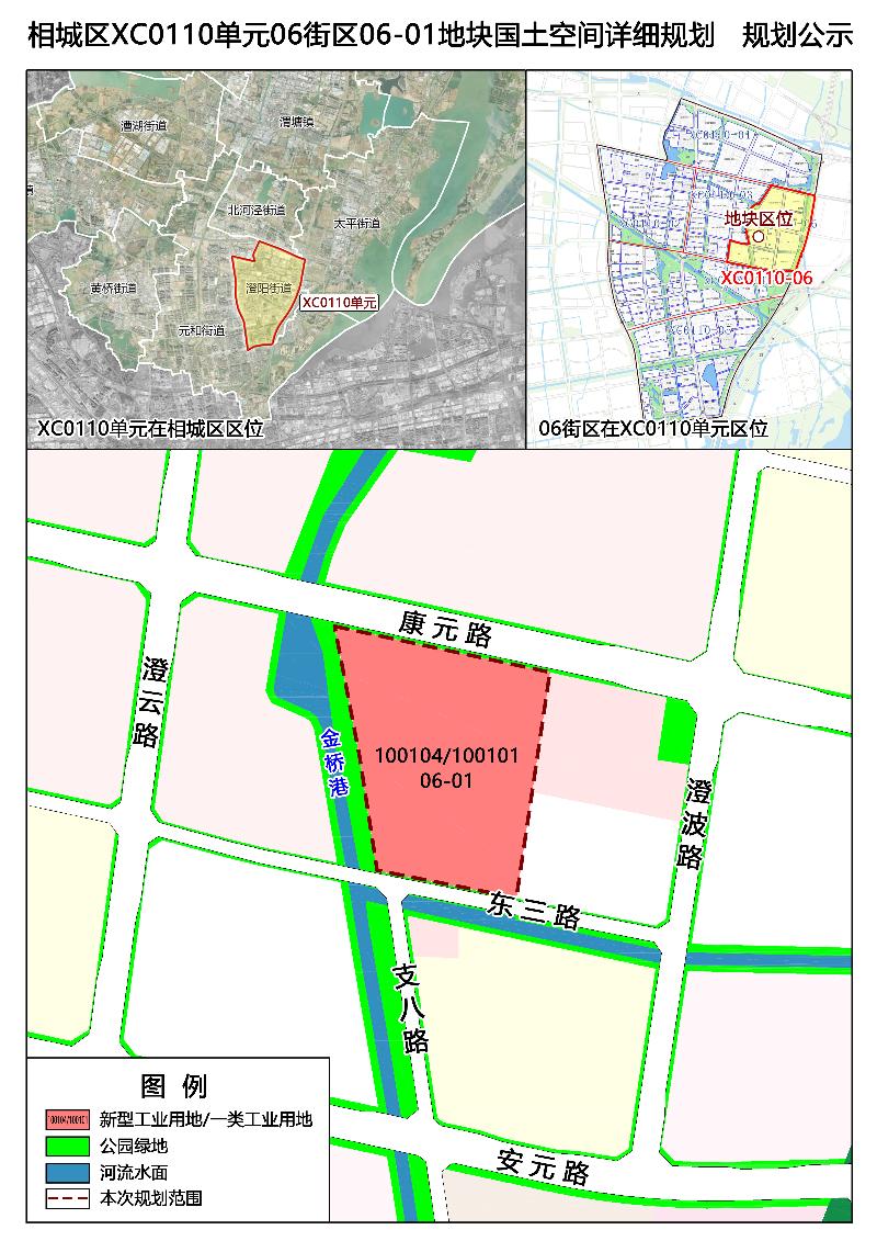 本次規(guī)劃對象為相城區(qū)XC0110單元06街區(qū)的06-01地塊。06-01地塊位于相城區(qū)澄陽街道,具體范圍為北至康元路、南至東三路、西至金橋港、東至現(xiàn)狀企業(yè)用地邊界,占地面積6.82公頃。